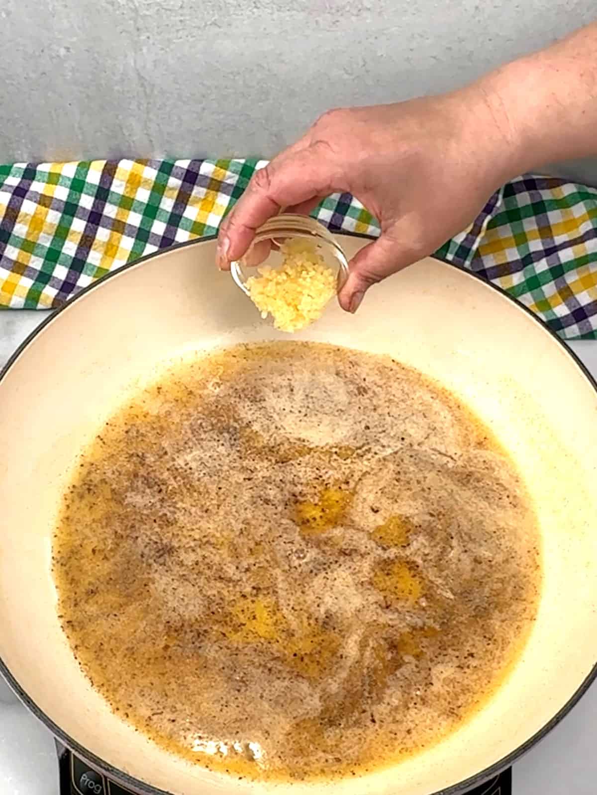 1. In the same pot you cooked the sausage in, melt salted butter. Once the butter has melted, stir in minced garlic and cook for 30 seconds stirring constantly.