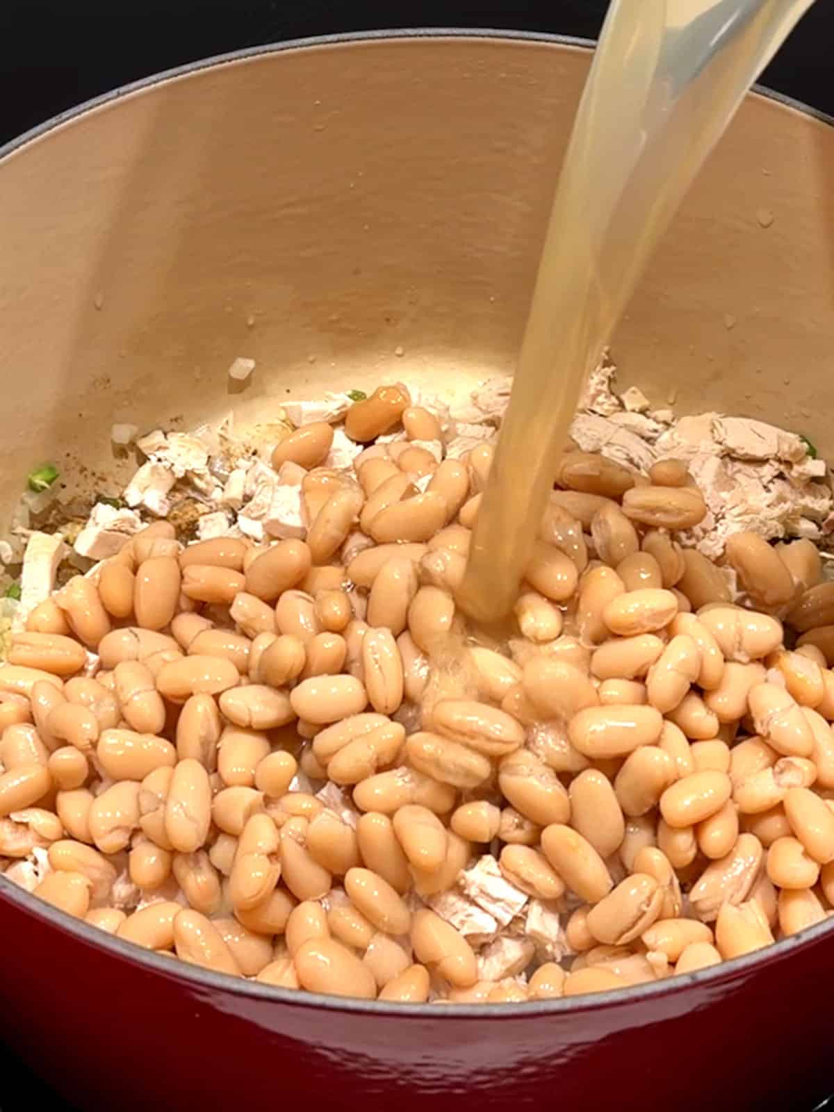 - Add the diced green chiles, shredded chicken, beans, and chicken broth. Stir to combine.