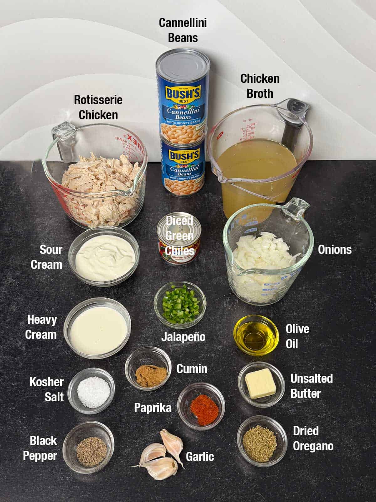 - Ingredients: Olive oil, butter, onions, jalapeňo, spices, diced green chiles, rotisserie chicken, cannellini beans, chicken broth, cornstarch, sour cream, and heavy cream