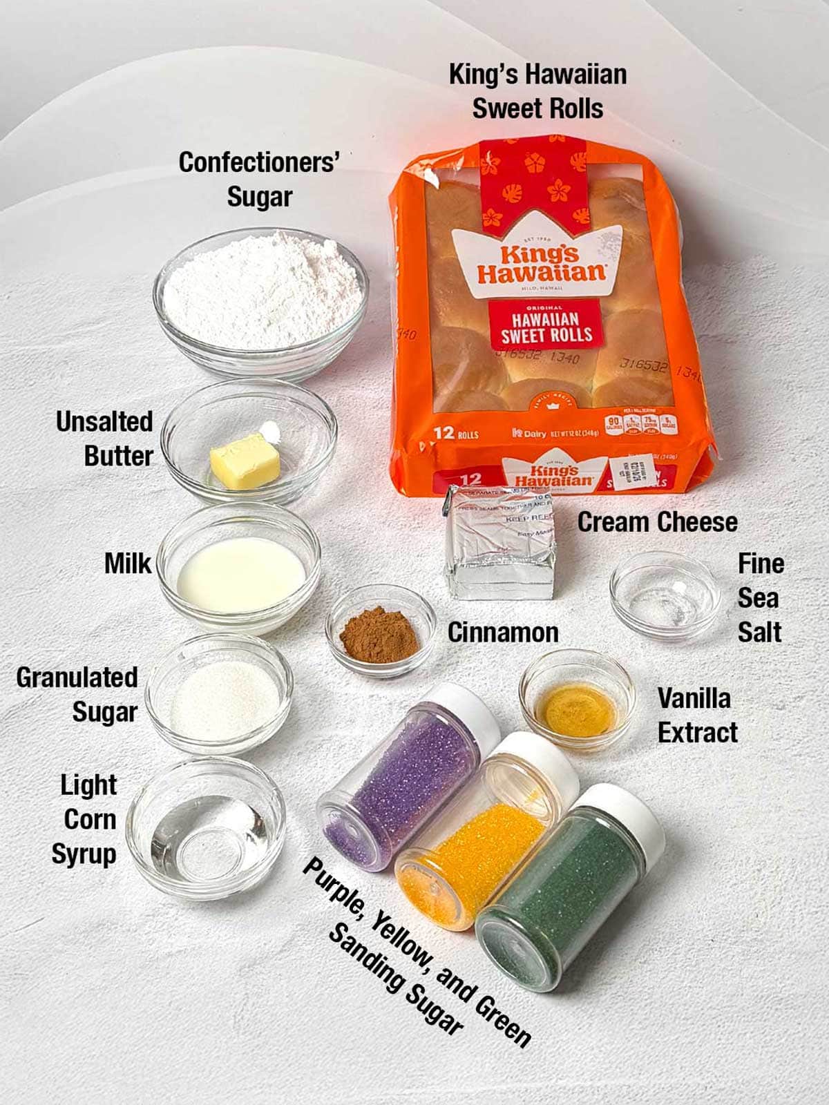 - Icing: Beat together confectioners' sugar, light corn syrup, milk, vanilla, and salt until the ribbons disappear into the icing after several seconds. Dip the tops of the Hawaiian rolls in the icing, allowing the excess to drip off. Immediately decorate with purple, yellow, and green sanding sugar.