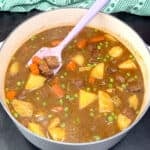 Remove the pot from the heat and stir in the frozen peas. Place the lid back on the pot for 15-20 minutes to allow the stew to cool, thicken, and for the flavors to meld flavors. At this point, taste the stew and adjust the salt and pepper if necessary.