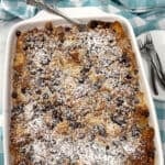 Let cool for about five minutes. Then, sift a little powdered sugar over the top and serve warm.
